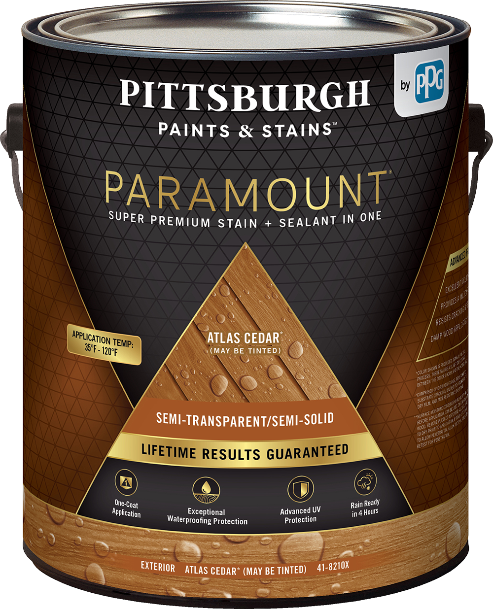 PITTSBURGH PAINTS & STAINS® Paramount super premium exterior sem-transparent/semi-solid wood stain and sealant in one offers two beatiful choices in one product. Semi-transparent provides subtle color to enrich wood's natural grain, and semi-solid provides the same rich color with more hide for wood with imperfections. It is available in fourteen beatiful, long-lasting colors, including two ready-to-use colors: Atlas Cedar and American Chestnut.